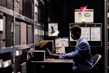 African american manager checking administrative files, analyzing bureaucracy record late at night in arhive room. Corporate worker in formal suit organizing accountancy documents. Depository concept