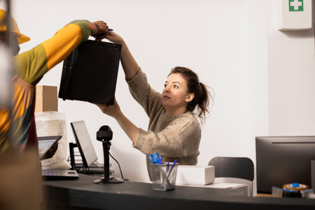 Dispatch workers processing orders for e-commerce delivery and checking the inventory, managing logistics for shipment in a small scale depot. Preparing packages for distribution.