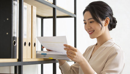 Confident businesswoman selecting files in an organized office, symbolizing professionalism and organization in a modern workspace
