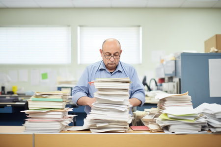 Overwhelmed young man surrounded by stacks of paperwork in a bustling office environment