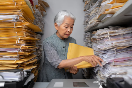Office worker searching through files in an archive room filled with shelves of documents, ensuring efficient organization and retrieval of information