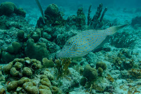 Spotted filefish, Oxymonacanthus longirostris, on a marine reef.