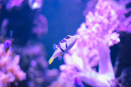 Yellow and white puffer fish swimming in the blue water aquarium.
