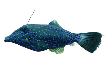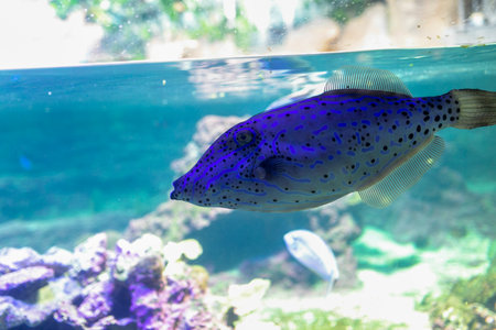 A beautifully patterned filefish, with a long snout and distinctive blue and black spots, swims gracefully in a brightly lit fish tank. High quality photo