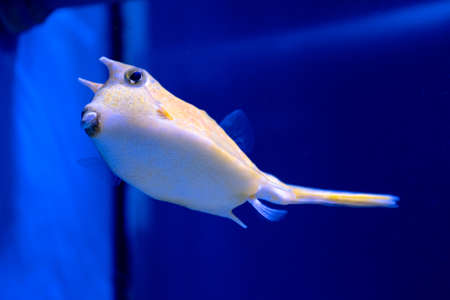 Colorful yellow Longhorn cowfish, Lactoria cornuta, also called horned boxfish swimming in aquarium near corals close up