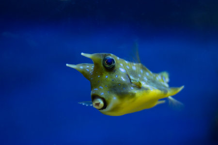 Close-up of thronghorn cowfish, showcasing its vivid yellow body and striking blue spots, set against the contrasting colors of a coral reef. Generative AI.