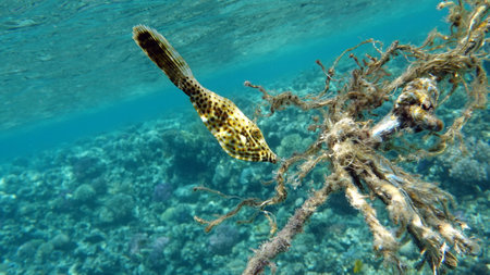 A vibrant fish with unique features gracefully navigates through a coral reef ecosystem showcasing its beauty and habitat.