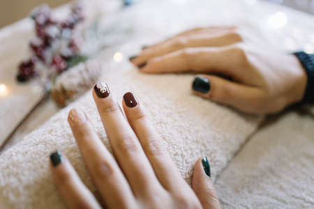 Close-up of female fingernails with painted snowman. Woman showing her Christmas manicure with painted snowman on middle finger at nail salon, with copyspace, close-up. Image can be used in websites, advertising, blogs and articles.