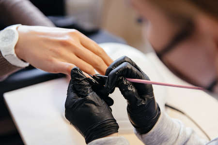 The master of nail extensions and coating with gel varnish makes correction to his client in the beauty salon
