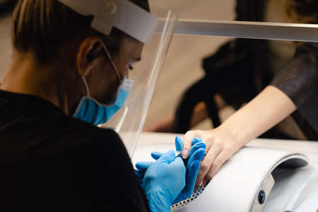 The client is undergoing a procedure with a manicure master. Manicurist apply gel polish to nails