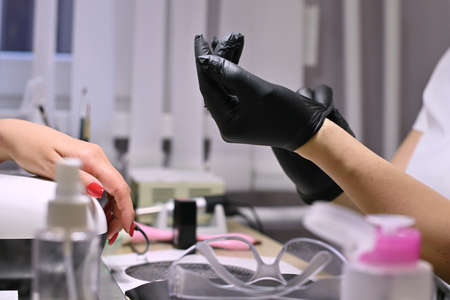 Close up details of woman hands in black gloves making manicure in luxury beauty salon with modern equipment, soft colors, nail service, perfect client hands.