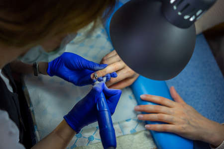Hardware manicure. Removal of old gel varnish in the salon. Manicure master doing beauty procedure for client, closeup and top view.