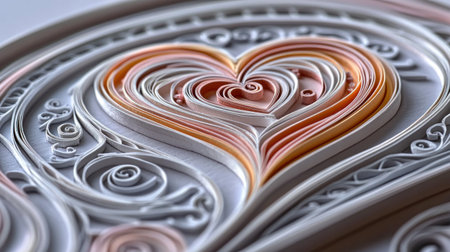 3D pink and white paper quilling of flowers with a heart, romantic, delicate, intricate details, pastel colors, close-up, high resolution, no background noise, floral patterns, lace textures, romantic atmosphere, love theme, Valentine's Day card design, play of light and shadow, elegant and sophisticated, delicate and detailed, high definition. --chaos 30 --ar 16:9 --v 6.1 Job ID: 86aca48b-1d9a-4f85-9d5a-1fe4a7c77515