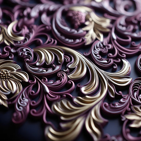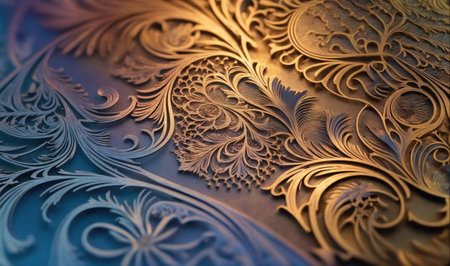 Beautiful close-up of a vintage floral design showcasing intricate details and textures. This artwork highlights craftsmanship, elegance, and ornate patterns, perfect for decoration.