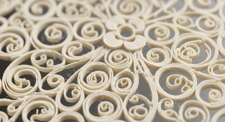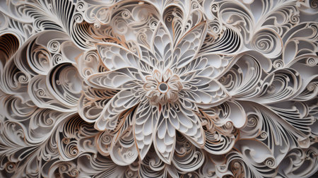 A macro photograph reveals the intricate details of a paper quilling design. Delicate, off-white paper strips are rolled and shaped into coils, spirals, and a central flower, creating a beautiful and complex pattern. The shallow depth of field emphasizes the texture and three-dimensional nature of the papercraft.