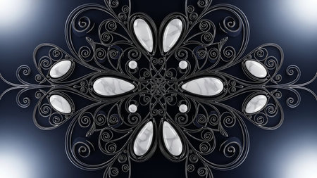 A symmetrical silver filigree mandala with teardrop-shaped marble inlays and small pearl accents against a dark blue gradient background.