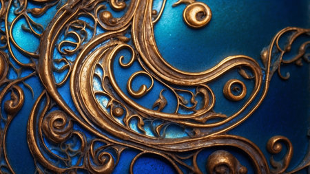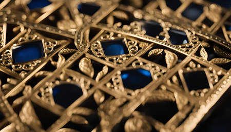 Close-up shot of an intricately gold and blue jewelry design, showcasing an intricate pattern with blue gemstones. The image captures the delicate details and craftsmanship of the piece, highlighting the beauty of fine jewelry.