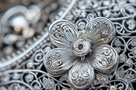 Close-up view of exquisite silver filigree jewelry featuring a delicate floral motif. This finely crafted piece highlights the intricate details and artistic skill involved in its creation.