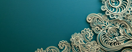 A cut-out paper banner with paisley patterns, layered on a rich teal background, creating a detailed and intricate visual.