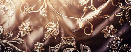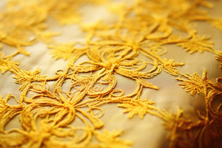 This close-up image features intricate golden embroidery on fabric, showcasing delicate floral patterns and artistic textures, perfect for luxury designs.