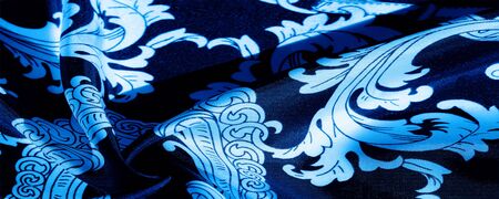 Texture, background, pattern. Silk fabric is blue and gold with a paisley pattern
