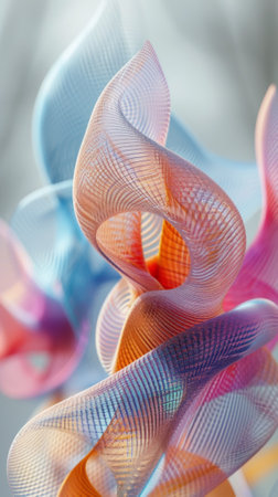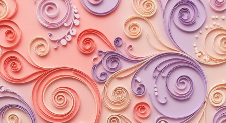 Craft a dreamlike composition that embodies the essence of whimsical design through intricate quilling art and paper art, featuring abstract swirls and delicate spirals in a harmonious balance of pastel colors such as coral pink, lavender purple, peach orange, and cream white; these organic shapes should flow seamlessly into soft gradients and flowing patterns, evoking an ethereal texture with decorative scrollwork reminiscent of a fairy tale illustration style, while maintaining a light and airy feel that invites viewers into a serene, imaginative world where every curve and spiral feels meticulously placed yet effortlessly natural.