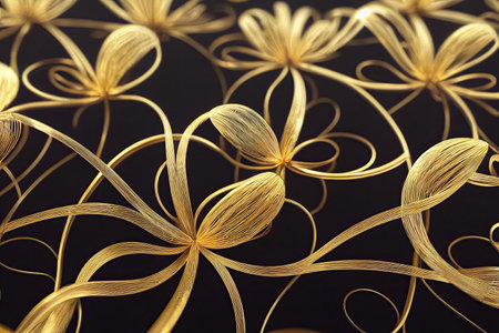 Decorative design with metallic flowers made of filigree gold wire on black background. Abstract luxury floral jewellery ornaments. Generative AI