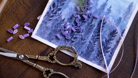 Hand painted scenery painted art on card and scissors on a wooden background. making quilling and painting greeting card