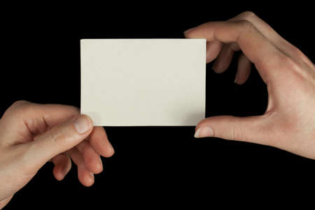 A man and a woman exchange business cards. Close-up view of the hands. Gray stone background.