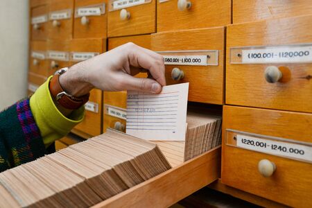 Search for information in the database. A man holds a paper card with information. Wooden cupboard in an office or library. Secret documents