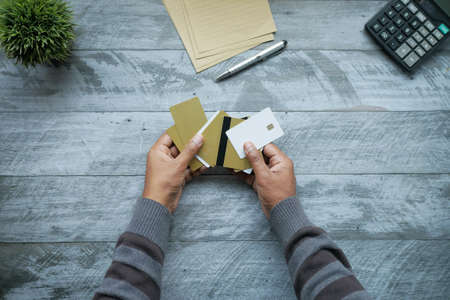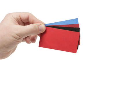 bank credit cards in a man's hand on a white fabric background, all cards in different colors, logos closed