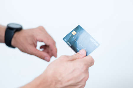credit card online payments. personal finances and money management. hand holding bank card on white background.