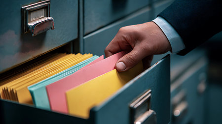 A male hand searching through confidential related documents in a filing cabinet drawer