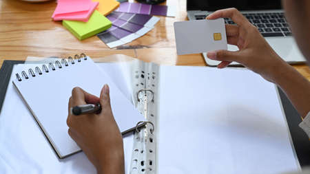 Hands holding credit card and making calculation of expenses. Online shopping using debit or credit card and calculating on the blank page at home. Cropped shot of a man's hands writing on a notebook.
