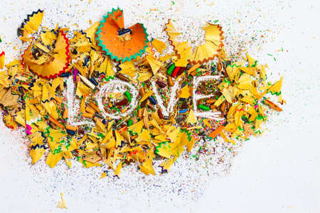 The word Love on the white background of colored pencil shavings with copy space