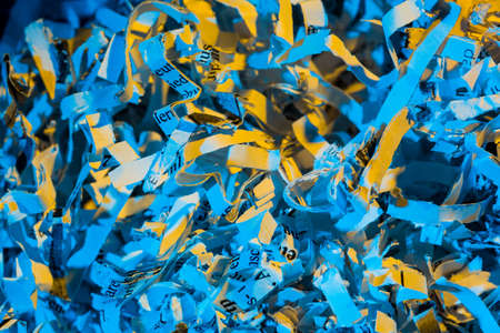 Shredded paper on light blue background. Selective focus image.