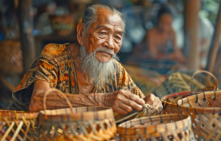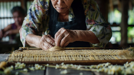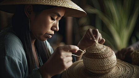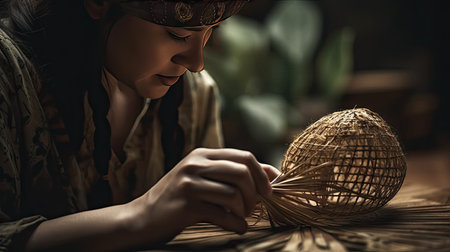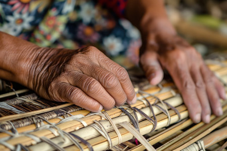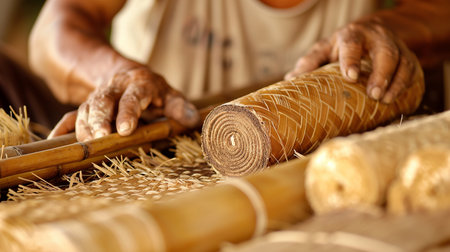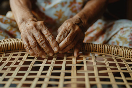 Close up of an artisan's hands meticulously weaving thin bamboo strips, creating a beautiful and intricate pattern