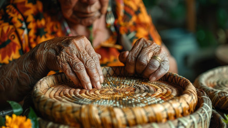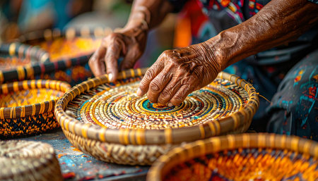 Indigenous Peoples' Day. A close-up shot of an Indigenous artisan weaving a traditional basket, their hands moving with practiced skill and precision.