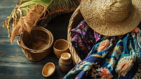 An artistic display of vibrant textiles, handmade baskets, and a straw hat showcases rich cultural heritage and artisanal craftsmanship in warm tones.