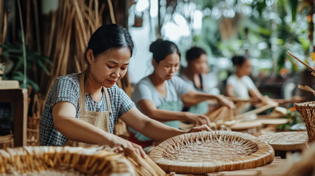 This image depicts artisans engaged in the intricate process of weaving beautiful baskets from natural materials. The scene captures the dedication and skill of these women in a vibrant workshop, showcasing their craftsmanship and cultural heritage.