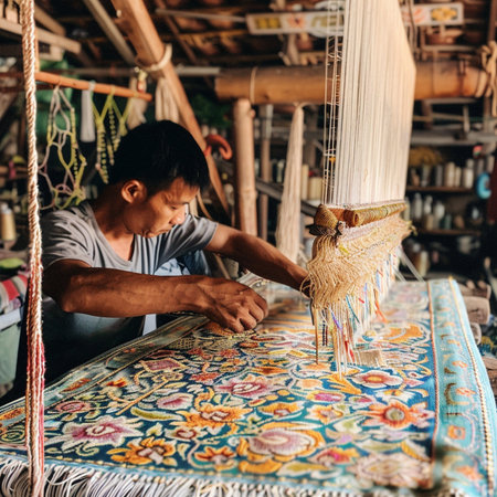Expert craftsperson weaving homemade textile on loom generated by artificial intelligence