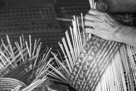 Close up of Asian old woman hands weaving bamboo mat in traditional way