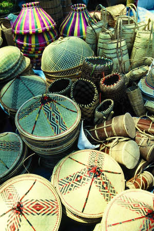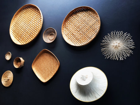 Handicraft handmade from natural product, wicker basket, woven bamboo plate and basket, weave rattan sheet. Eco friendy and sustainable concept