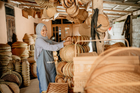 happy asian handicraft artist are working on their woven bamboo product in the shop