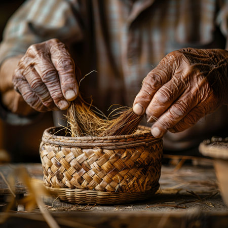 Craftsman's hands weave a basket, showcasing real textures and skilled craftsmanship essence
