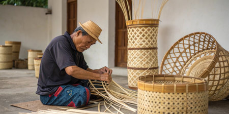 Craftsman weaving bamboo strips into traditional basket in workshop