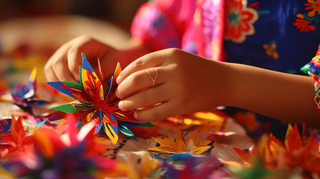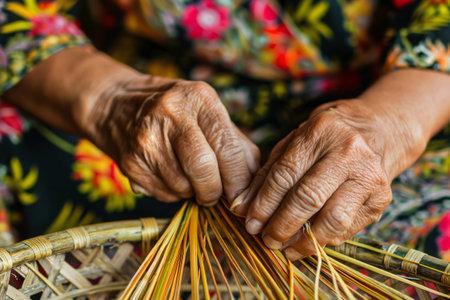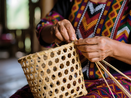Close up of an artisan's hands meticulously weaving colorful bamboo strips, showcasing traditional craftsmanship