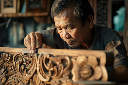 Craftsman is carefully sanding a beautiful wood carving, showcasing the traditional artistry of Vietnam