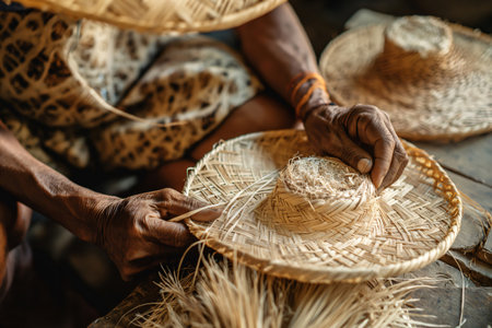 Craftsman weaving dried palm leaves to make a traditional raffia palm hat, showcasing the artistry and skill of traditional craftsmanship