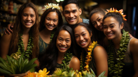 Fa'afafine gender identity in Samoan culture. Group of samoa women and men with Hawaiian flowers in their hair.